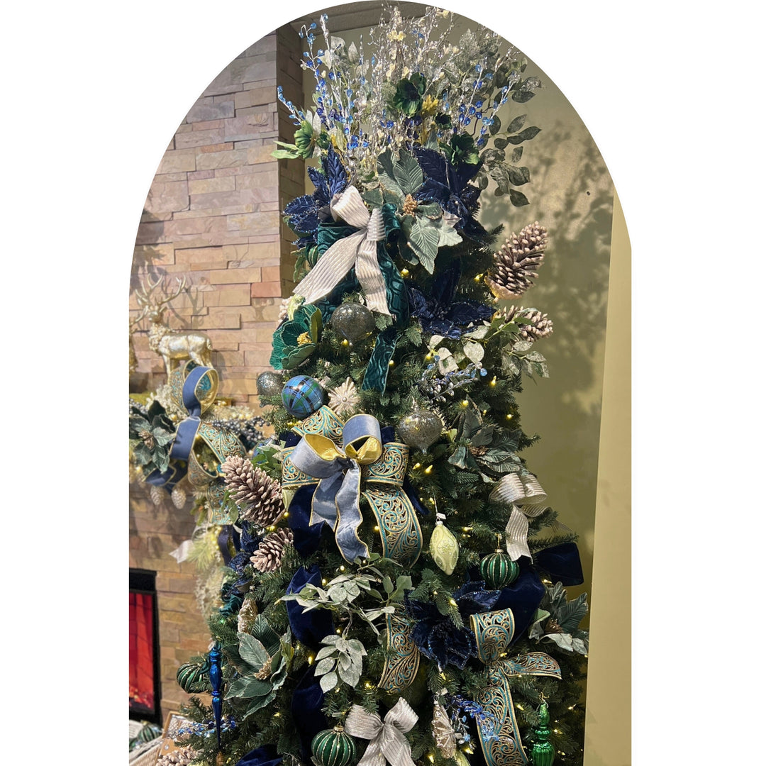A moody, nature-inspired collection blending deep blues and teals with warm woods, pewter metallics, and rich winter textures.