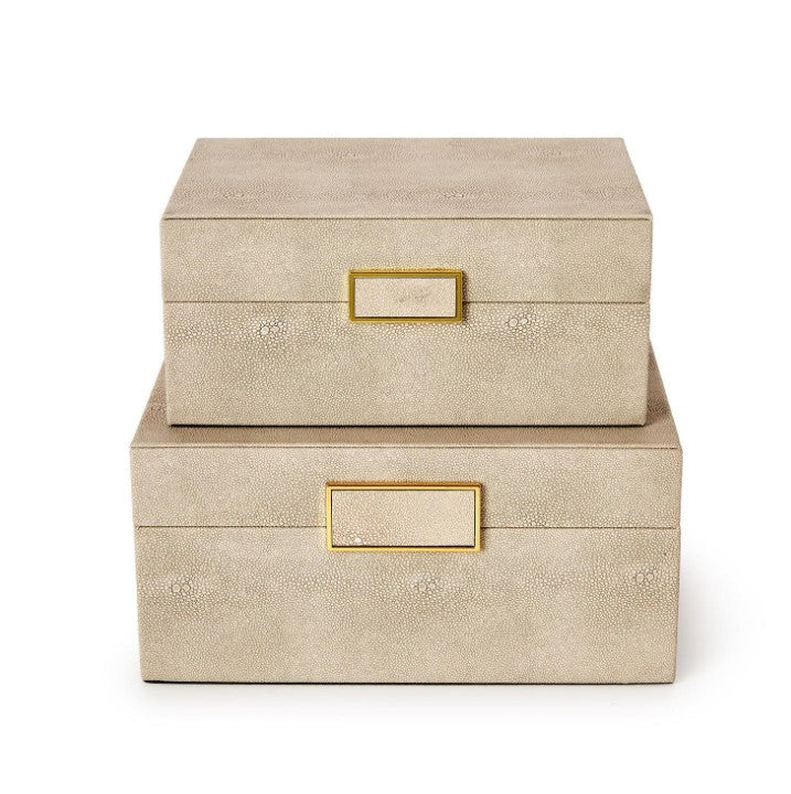 Elevate your space with our Cream Shagreen Boxes, where sophisticated texture meets timeless elegance. Crafted from luxurious faux leather in a soft cream finish, these decorative boxes add refined style to any room—from bedroom nightstands to living room shelves. Available in two versatile sizes, you can mix and match to create a curated display that perfectly suits your décor. The distinctive faux leather texture catches light beautifully, making these boxes as visually striking as they are functional. Ideal for storing jewelry, keepsakes, or simply showcasing as standalone décor pieces.