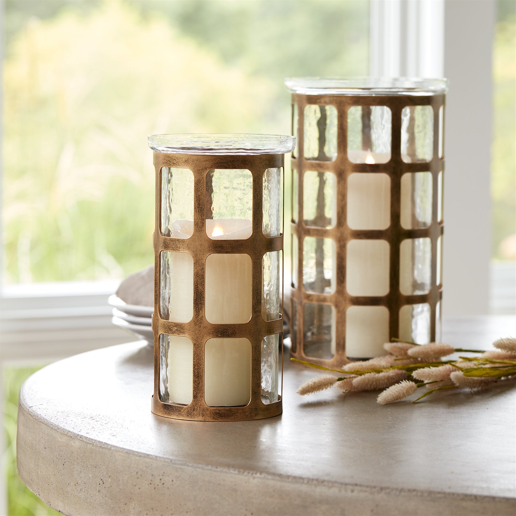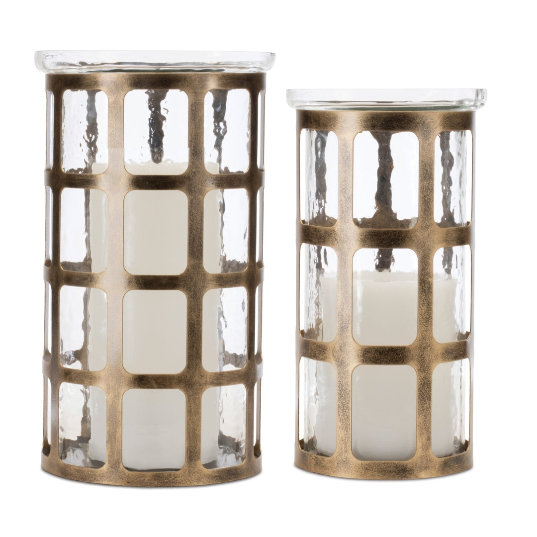 Enhance your space with our Antique Bronze Windowpane Candle Holders. Available in 2 sizes, these elegant holders feature glass hurricane candle holders inside an antique bronze colored iron windowpane. Add a touch of vintage charm and illuminate any room. Candles not included.