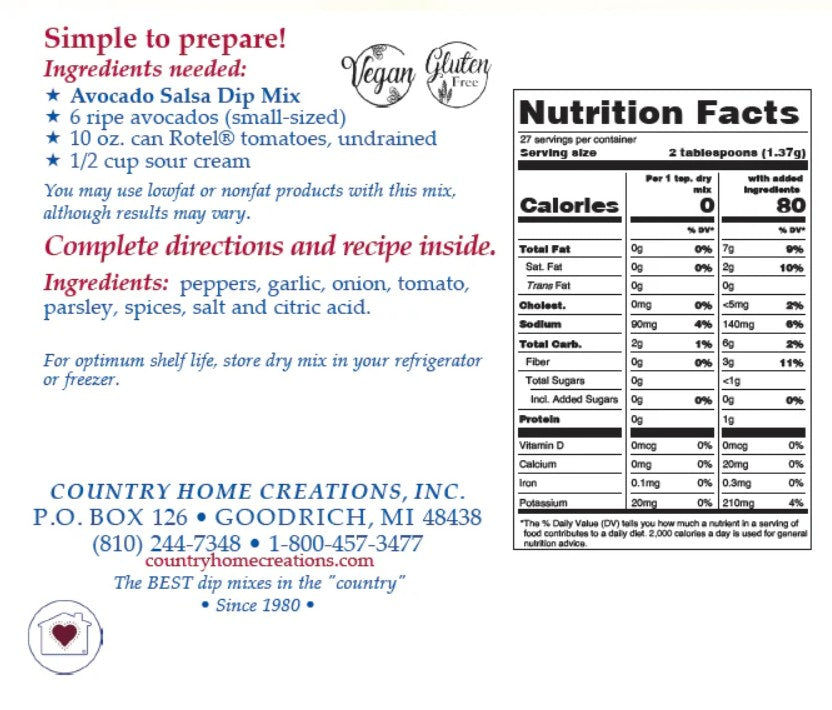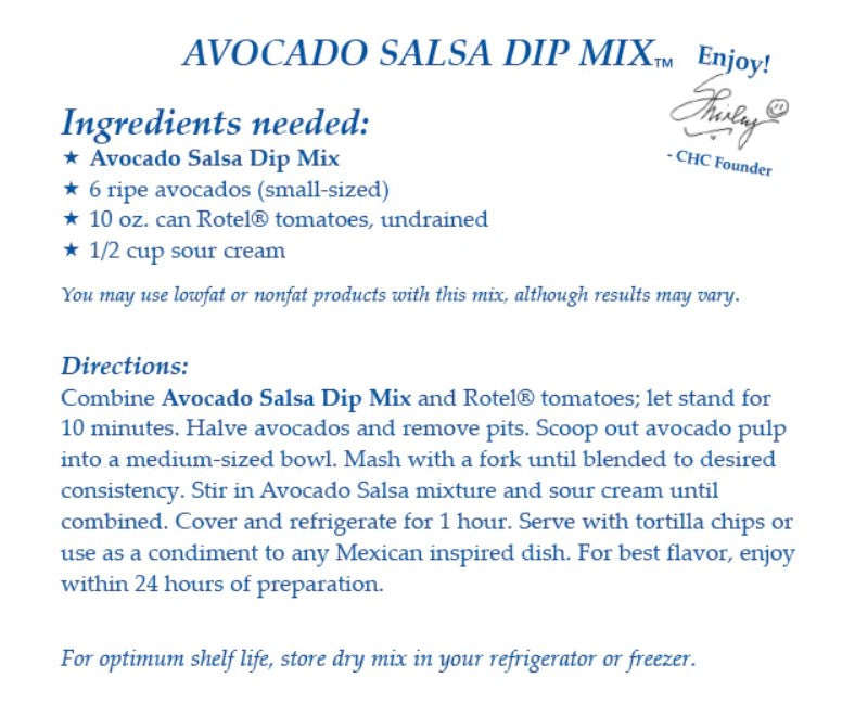 Craving a flavor explosion? Our Avocado Salsa Mix is the ultimate flavor fusion, blending the creaminess of avocado with the zesty kick of salsa. Enjoy it as a dip, topping, or straight off the spoon - this versatile salsa elevates any snacking experience. No dairy products required to complete this mix.