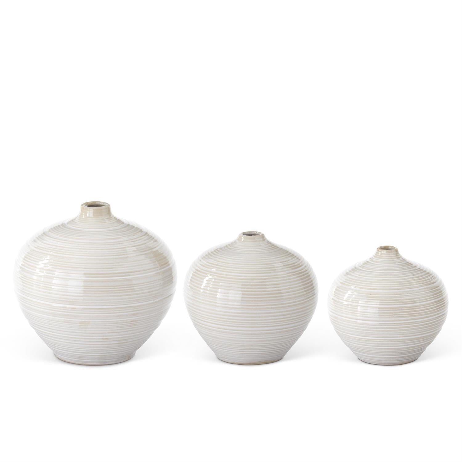 Bring subtle elegance to any space with these charming ceramic bud vases. Each piece features a classic tan and white striped pattern that complements both modern and traditional décor. The rounded, bulbous silhouette creates a graceful focal point perfect for displaying single stems or small floral arrangements. Available in three convenient sizes, you can mix and match to create a curated display on shelves, desks, or windowsills. Handcrafted quality meets timeless design in this versatile collection.