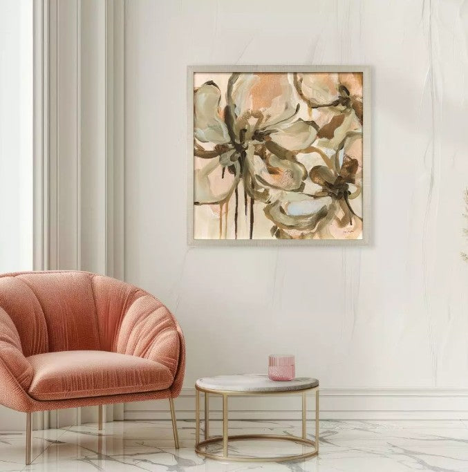 Playful flower petals have a light-hearted whimsical feel. Framed to the image and complemented with a champagne gold block contemporary moulding.