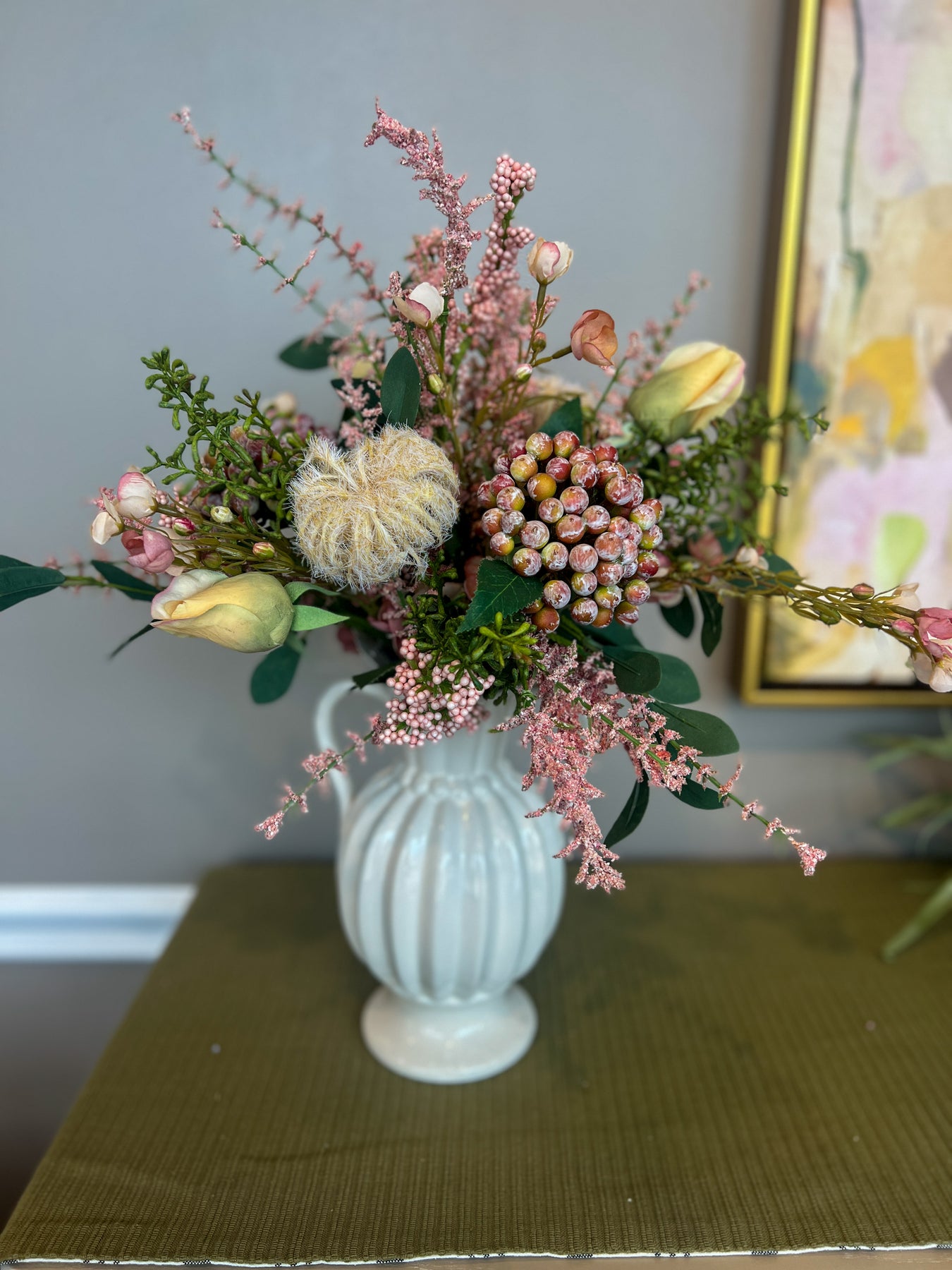 Brighten your space with this custom Instant Arrangement, thoughtfully styled by our designers to bring bold seasonal tones to your home. This stunning arrangement features coral bush, delicate seed spray, and soft yellow preblooming roses for a fresh, garden-inspired look. Just drop it into a vase, fluff the stems, and enjoy instant style — no arranging required.