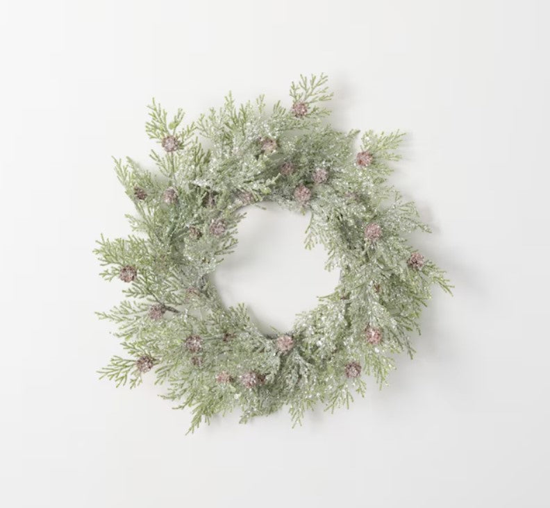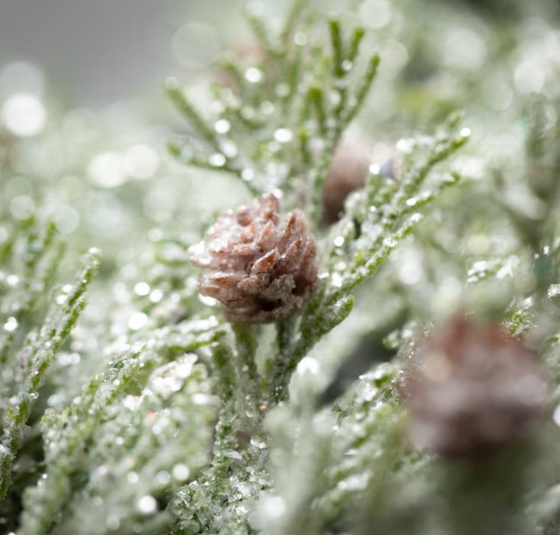 A dreamy mix of cottage charm and winter magic. Soft greens, rose golds, and gathered florals create an ethereal, romantic holiday setting that feels straight out of a fairytale.
