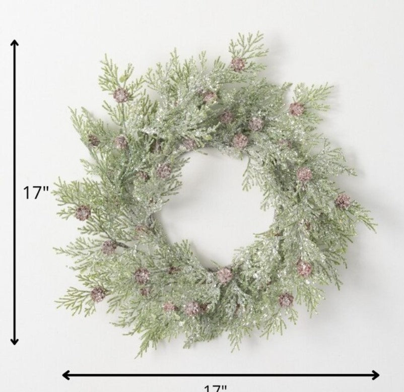 Jack Frost has arrived with this beautiful 17" frosted mini wreath. With soft green cedar accented with pinecones, this exclusive mini wreath is the perfect final touch to any holiday decor. Accentuate your space with this festive green mini wreath.