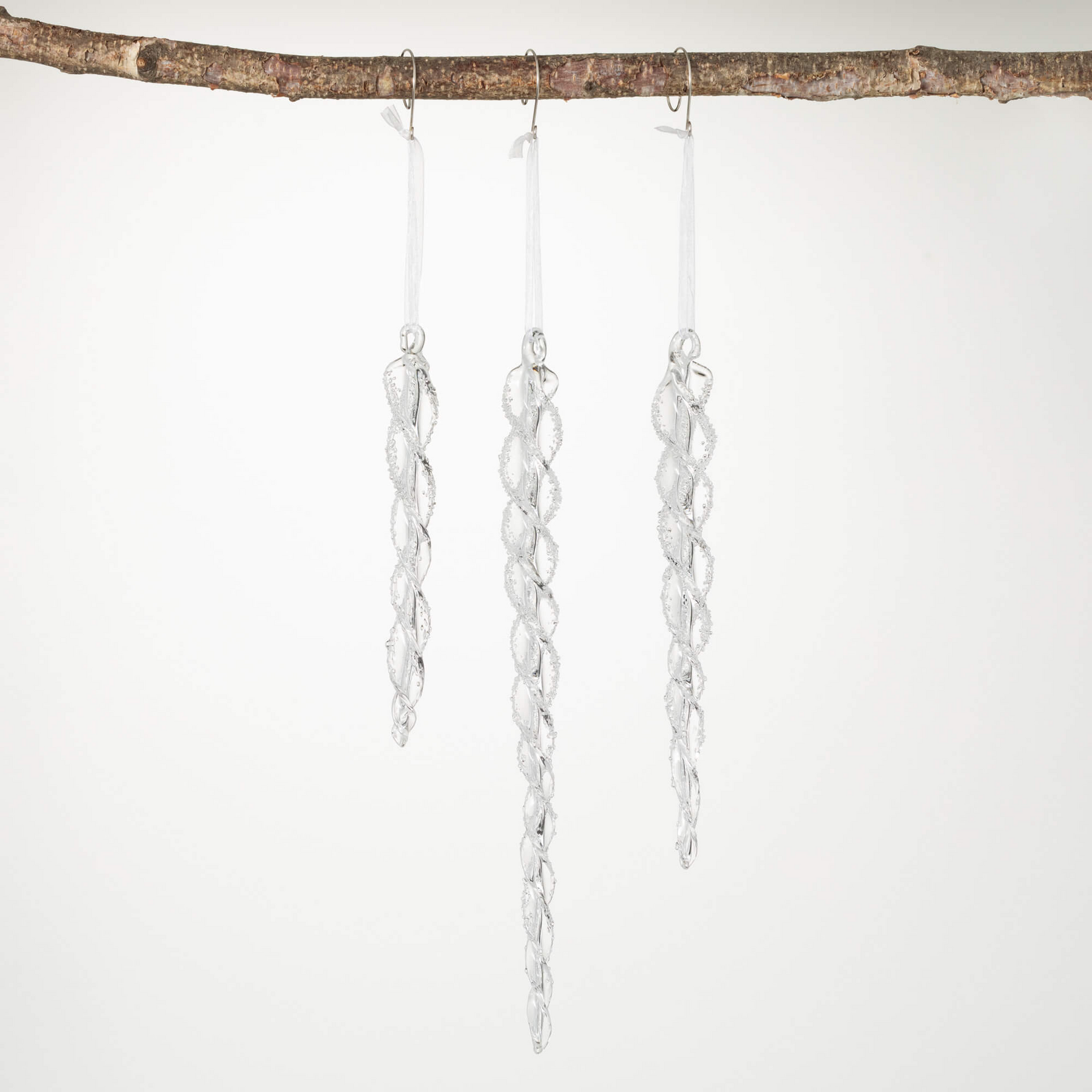 Enjoy the unique look of these clear modern hand-blown twisted glass icicles. The shape of these Christmas ornaments will add an element of texture to your Holiday decor. Admire their timeless beauty as they hang from your evergreen branches. These ornaments come in three different sizes to choose from, allowing for a range of unique designs and a touch of personal flair to your home.