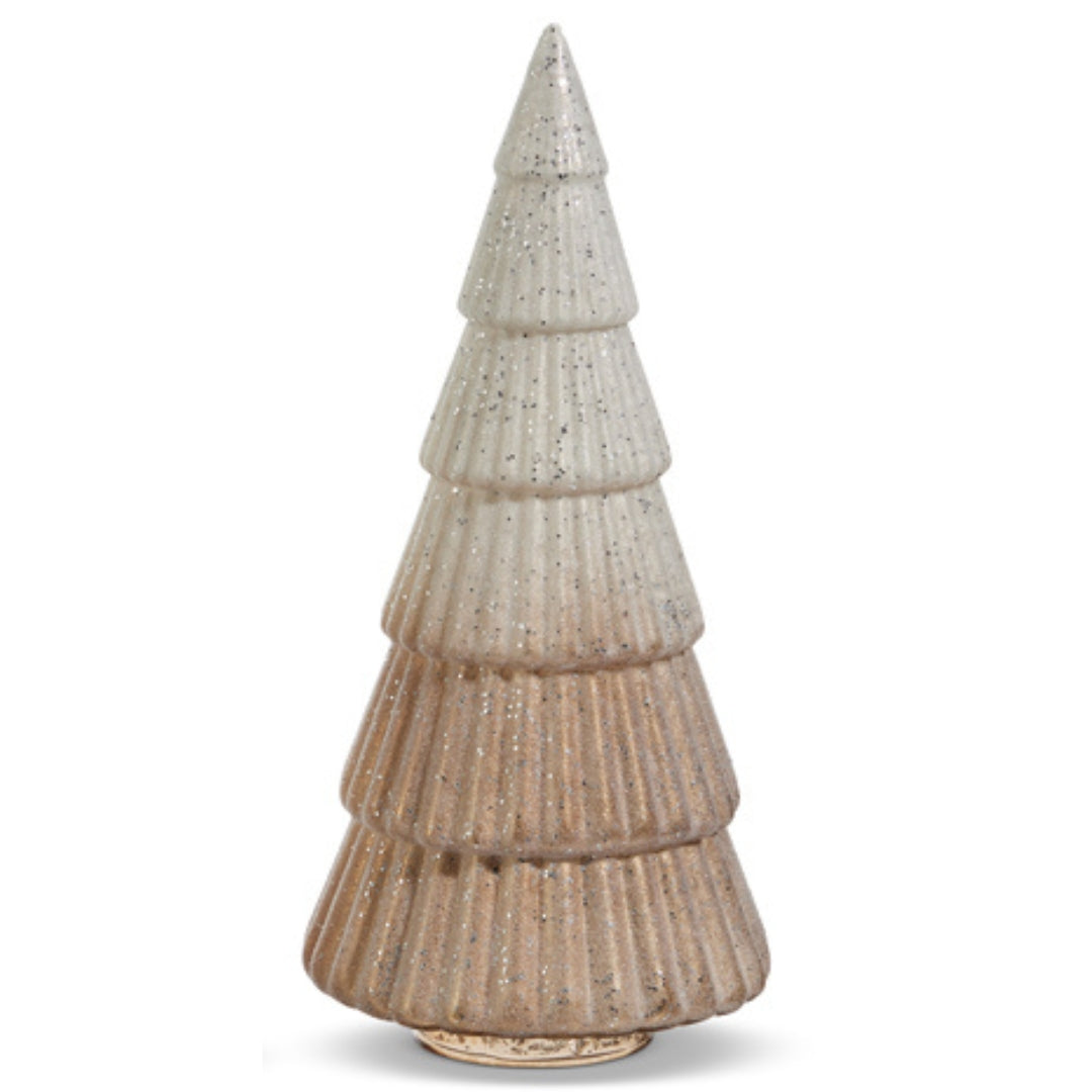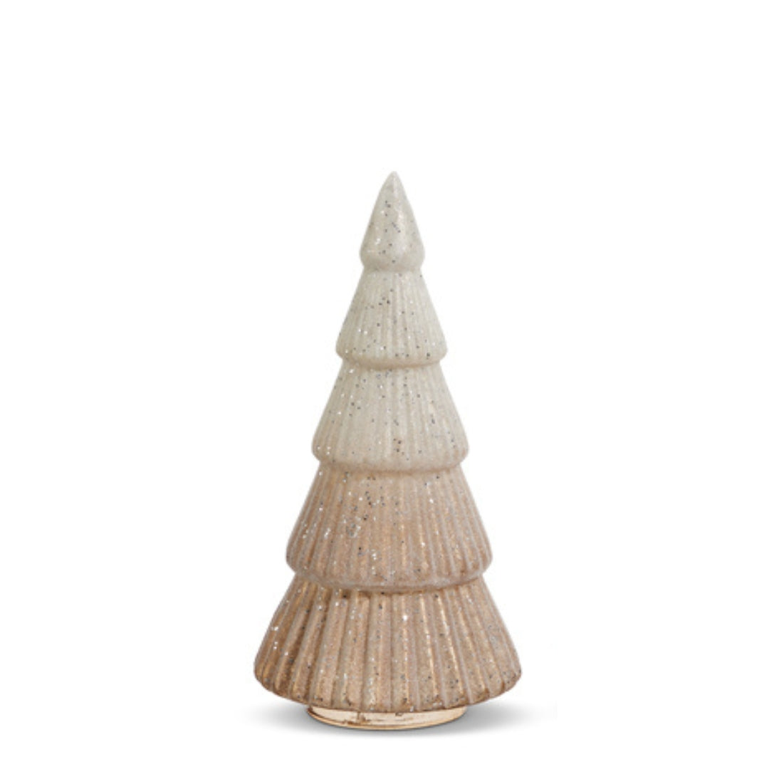 Add a touch of sparkle to your holiday decorations with our Glitter Ombré Ribbed Trees! Made with intricately crafted ribbed glass, these trees feature a stunning gradient from cream to mocha, and are delicately dusted with glitter for an extra festive touch. Create a magical and elegant ambiance this season with these one-of-a-kind trees. With two size options to choose from, elevate your style this Holiday Season! These trees are great for trays and mantle displays!
