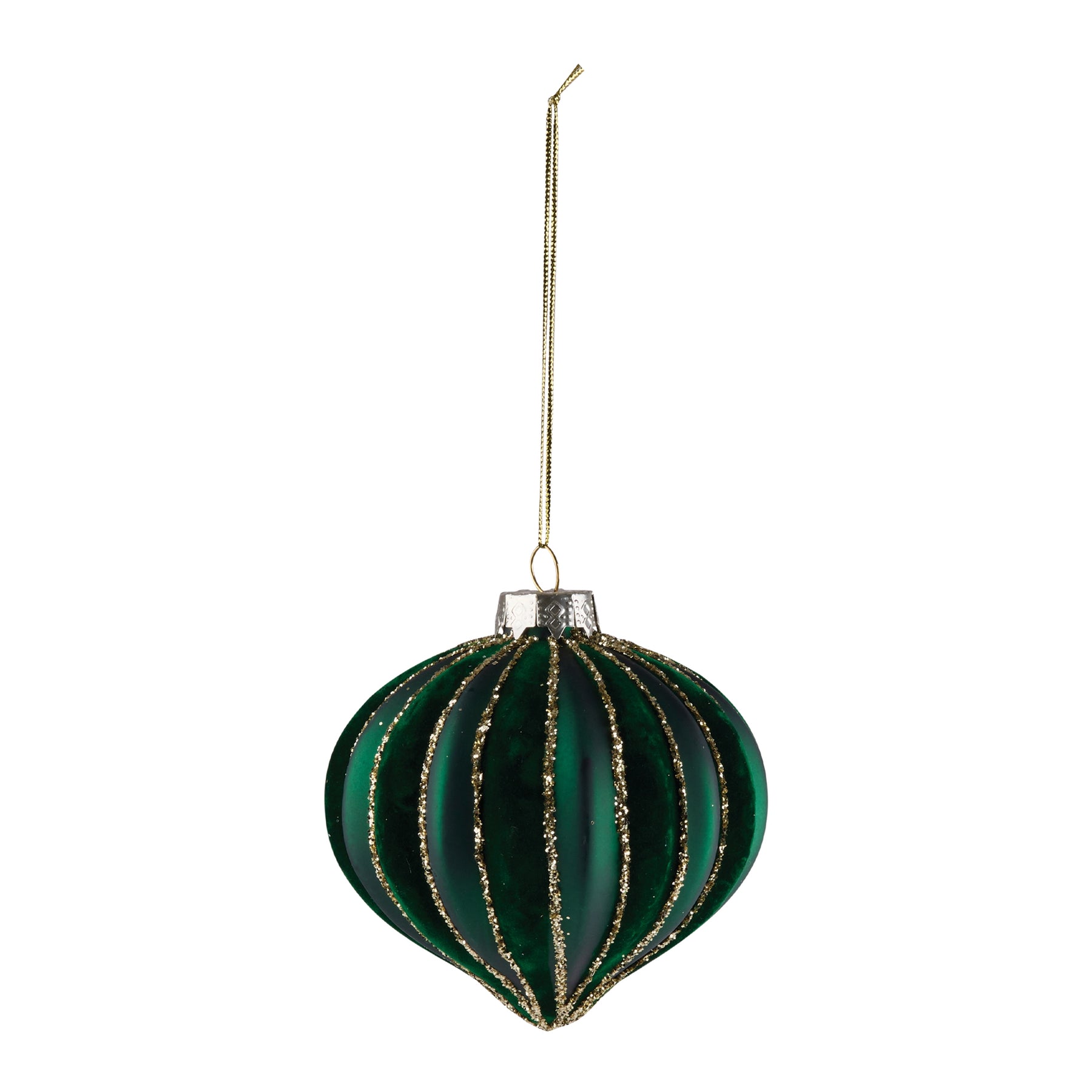 Elevate your holiday décor with this exquisite Green Velvet Onion Glass Ornament. Featuring an elegant onion shape, it alternates between sumptuous velvet and smooth glass panels, each bordered with delicate gold glitter that catches the light beautifully. This ornament adds a refined touch of texture and shimmer to any tree or seasonal arrangement, creating a luxurious and timeless festive ambiance.