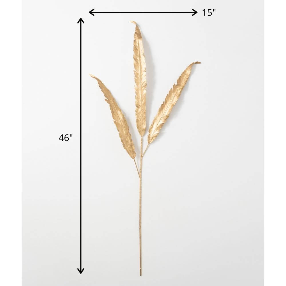 Shimmering with a trio of golden leaves that feature and ever-so-light dusting of gold glitter, this feather stem stands 46" tall. Affixed to a golden covered branch, this stem will bring a sophisticated style to any design.